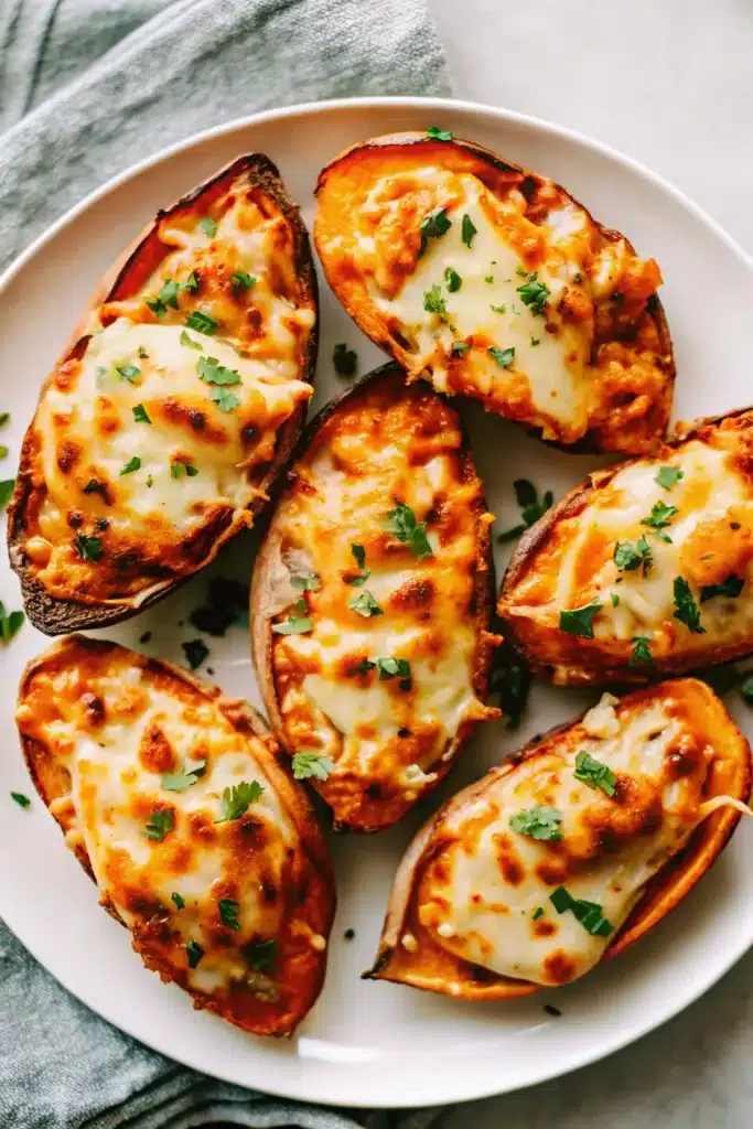 Sweet potatoes are basically nature’s edible bowl, and when you stuff them with melty cheese and whatever else you’ve got lying around, they transform into a legitimate meal. It’s comfort food disguised as health food, which is the best kind of deception.