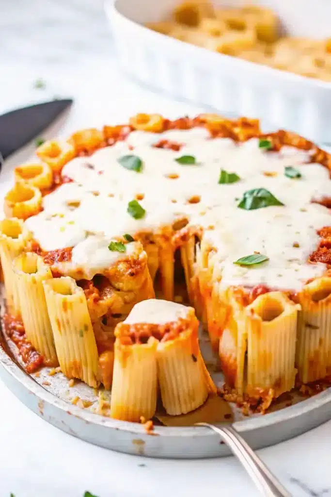 But here’s the thing—it’s not just Instagram bait. The vertical pasta situation actually serves a purpose. Each rigatoni tube becomes a little vessel for sauce and cheese, and when you bake it, the tops get crispy while the insides stay saucy. You get texture contrast in every single bite, which regular baked pasta just can’t deliver.