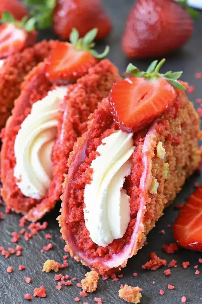 Let’s be real—these Strawberry Crunch Cheesecake Tacos aren’t actual tacos. Nobody’s putting ground beef and lettuce in here (and if you are, we need to have a serious conversation). These are crispy, crunchy taco-shaped shells filled with creamy no-bake cheesecake, topped with fresh strawberries and that magical pink crunch coating that tastes like nostalgia and summer. They’re fun, they’re Instagram-worthy, and honestly? They’re way easier to make than they look.